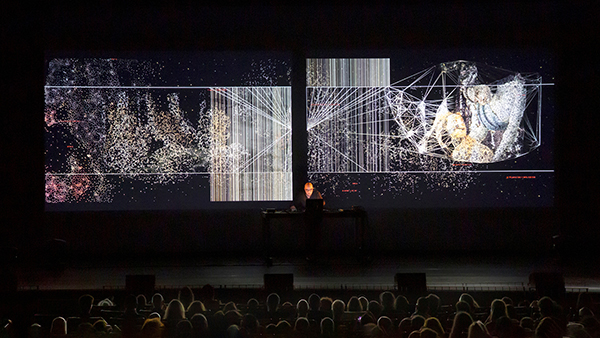 Les regards des peintres, fixés sur la toile pour la postérité, et ceux renvoyés par les figures représentées sont absorbés dans un processus qui établit à son tour un troisième regard. Cet Œil numérique, apparu lors de la première phase d’expérimentation, m’a fasciné au point de me pousser à construire l’ensemble de la performance à base de cette idée, en imaginant le parcours d’une intelligence artificielle et ses différentes étapes d’appréhension, d’intériorisation et d’auto-expression, du concept de grâce.