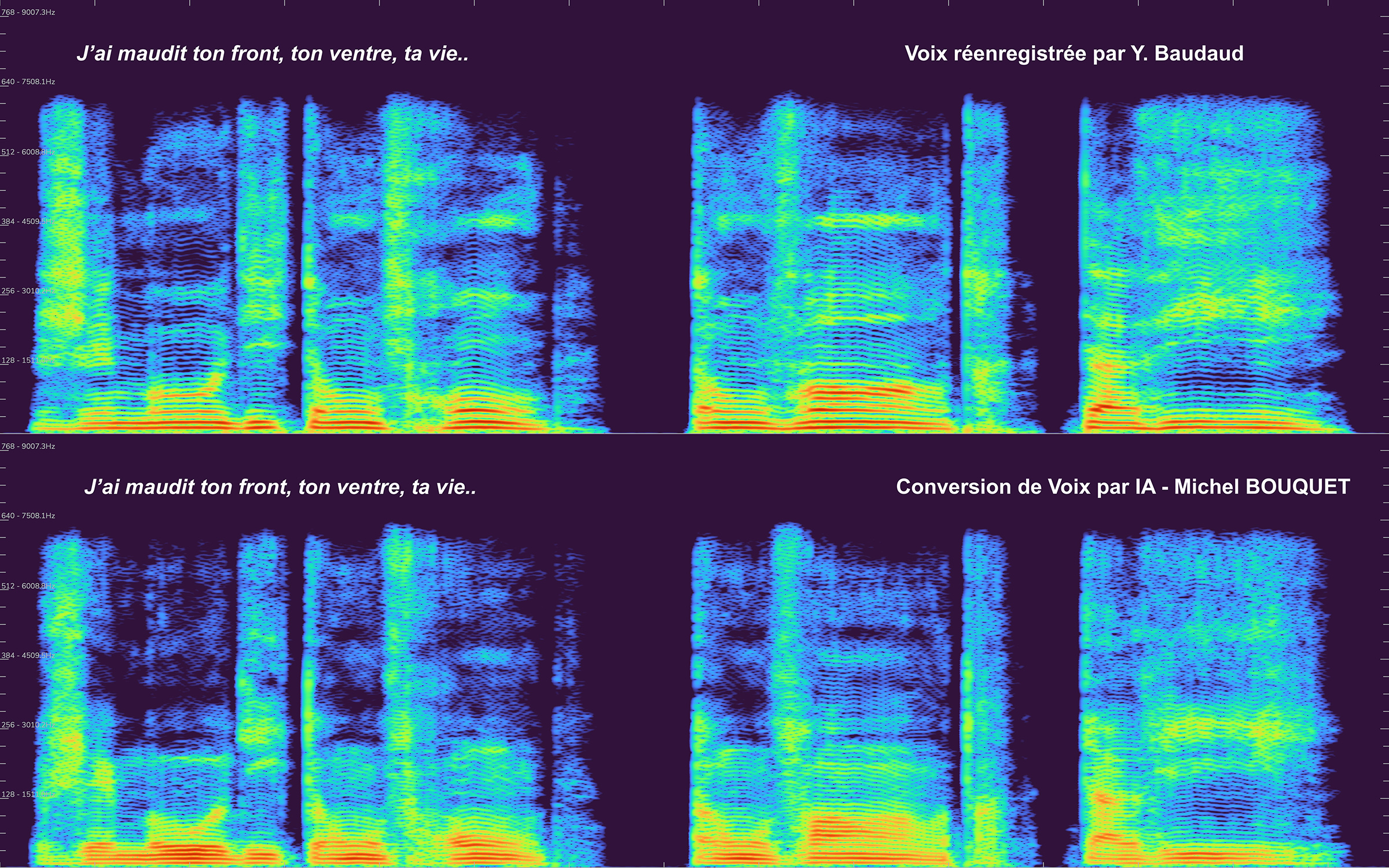 Pierre Boulez avait travaillé avec Michel Bouquet, qu’il avait enregistré en train de lire le texte d’Henri Michaux. Dans l’enregistrement du concert toutefois, la voix traitée apparaissait très abimée et presque toujours incompréhensible. Il fallait la récréer. Au début, nous avons fait appel au comédien Yann Baudaud, pour réenregistrer le poème de Michaux, en lui demandant d’imiter les inflexions vocales du comédien originel, Michel Bouquet. J’ai ensuite travaillé pendant quelques mois avec Axel Roebel, chef de l’équipe Analyse/Synthèse à l’Ircam, pour développer un algorithme d’intelligence artificielle capable de faire une conversion de voix, à partir de celle de Yann Baudaud pour reproduire celle de Michel Bouquet. J’ai considéré qu’il était absolument nécessaire de restituer l’esprit originel de la pièce telle que conçue par Boulez. C’est donc sur cette voix reconstruite de Michel Bouquet que j’ai appliqué de nouveaux traitements (photo ci-dessus), totalement cohérents avec les intentions de Boulez, mais plus modernes et raffinés, pour ensuite la spatialiser en accord avec ses indications.
