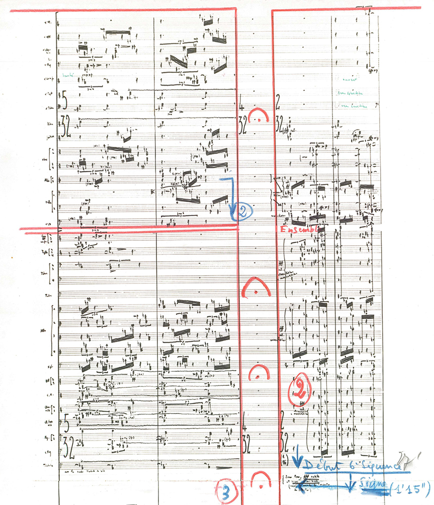Toutefois, en travaillant avec la partition d’orchestre, début 2024, une évidence s’est imposée : non seulement cette partition manuscrite était incompréhensible – et donc injouable –, mais son déroulé ne correspondait pas non plus à ce qu’on entendait dans l’enregistrement du concert ! En fait, la partition dont on dispose n’est qu’une première version de travail, que Boulez a constamment modifiée et réorganisée sur place, au fil des répétitions et à mesure qu’il avançait dans la réalisation des neuf séquences électroniques de la pièce. Elle est donc parsemée de sauts et de reprises ajoutées, destinées à démultiplier la durée de certains passages, afin d’accueillir les séquences électroniques qu’il était en train de produire. Il m’a fallu analyser longuement tout cela, en vérifiant tous les passages à l’oreille sur l’enregistrement– afin de reconstituer une nouvelle partition exploitable, qui tienne compte de toutes les modifications.